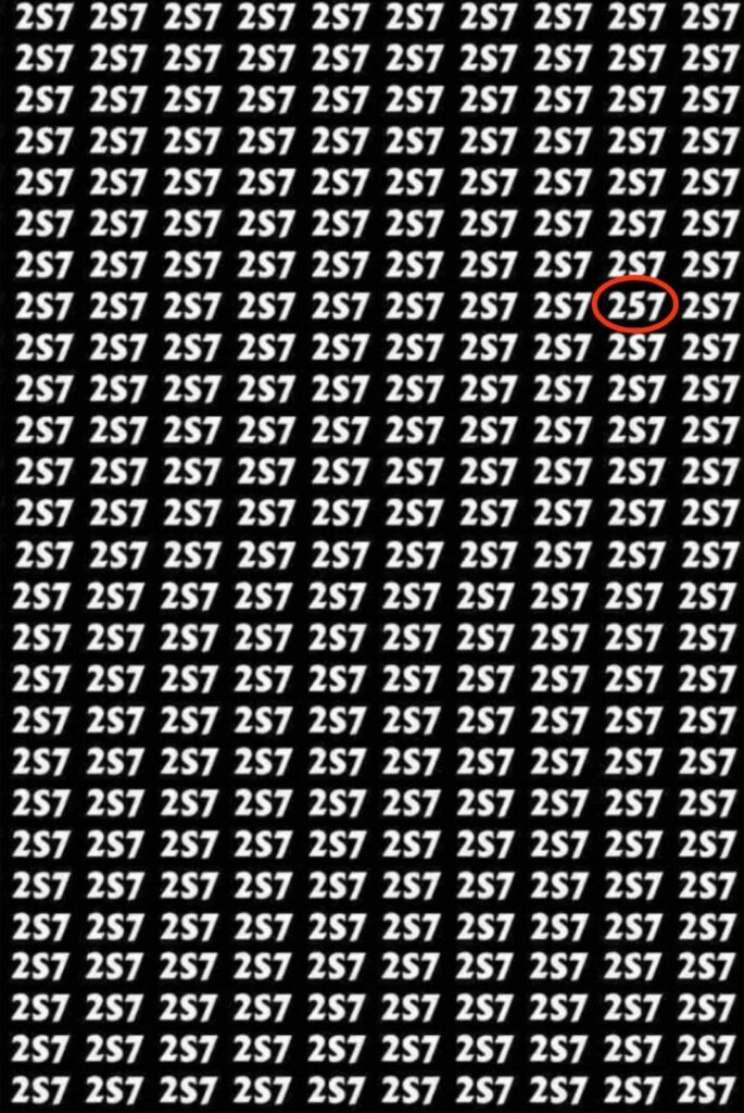 இது உங்கள் உற்றுனோக்கும் திறன் மற்றும் கண்காணிப்புத் திறனைக் கூர்மைப்படுத்தும். கீழே உள்ள படத்தில், பல ‘2S7’ என்ற எண்களுக்கு இடையே ‘257’ என்ற எண் மறைந்துள்ளது. இதனை 10வினாடிக்குள் கண்டுபிடிக்க வேண்டும். இந்த விளையாட்டில் பெரும்பாலான போட்டியாளர்கள் தோல்வியை தழுவி விட்டனர். நீங்களும் ட்ரை பண்ணுங்கள். 10 வினாடிகளுக்குள் சரியான விடையை கண்டுபிடித்துவிட்டால் நீங்களும் கில்லிதான்.